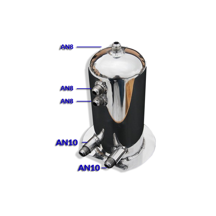 Surge tank 2.5L, made of lightweigh polished alloy. Tank eqipped with AN10 fittings. Perfect choice for drift. Tank helps prevent fuel starvation and provides consist fuel delivery to fuel pump.