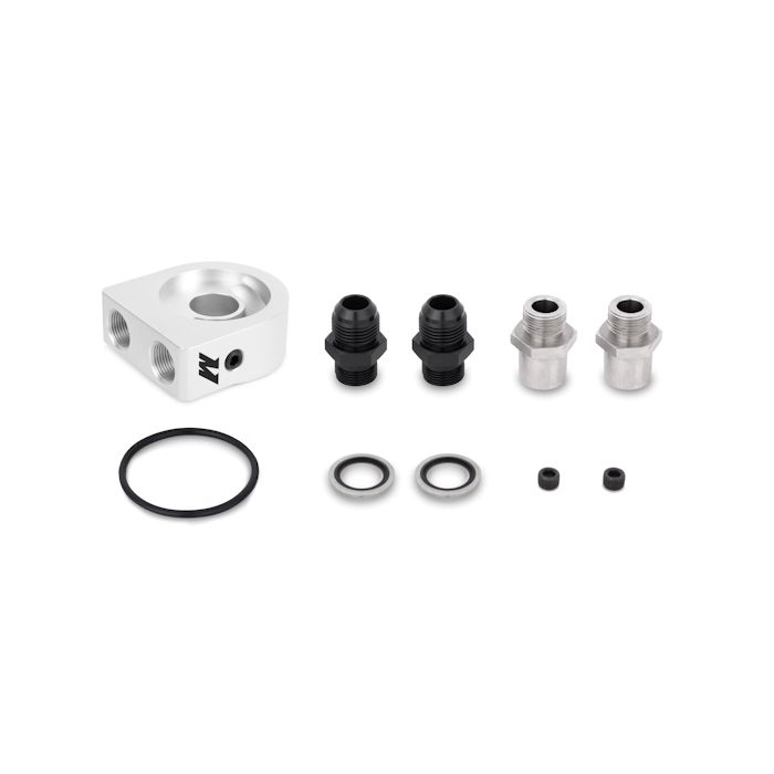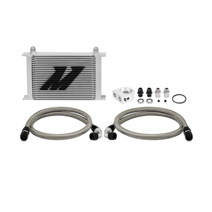 Proper oil temperature regulation is key to extending and preserving the life of your stock or high performance engine. Keep your temperatures in check with the Mishimoto 25-Row Universal Oil Cooler Kit. This kit is applicable for most vehicles and includes all key components for reducing oil temperatures and providing your engine with extra protection against oil degradation. This kit includes a billet anodized aluminum sandwich plate in either standard or thermostatic form. The optional Mishimoto Thermostatic Sandwich Plate provides additional temperature control and will limit oil flow to the cooler until optimal temperatures are reached, making it ideal for those in cooler climates. The included core is our proven 25-row stacked-plate cooler, which can withstand high fluid pressures and significantly reduce oil temperatures while exhibiting minimal pressure loss. This kit includes both a 3/4" -16 and M20-1.5 sandwich plate adapter which supports fitment for most makes and models. This kit also includes pre-assembled stainless steel braided oil lines with -10AN fittings and dowty seals for durable, leak free connections. Whether you are piloting a boosted rotary or a blown small block, the Mishimoto 25-Row Universal Oil Cooler Kit will provide the efficiency you need to stay on the track and out of the shop. As with all our products this kit includes the Mishimoto Lifetime Warranty.25 row stacked plate cooler with universal fitmentOverall Size: 12.95" x 8.35" x 1.97" / Core: 11" x 7.32" x 1.97" / Rows: 25Withstands high fluid pressures and reduces oil temperaturesIncludes both a 3/4" -16 and M20-1.5 sandwich plate adapterMishimoto Lifetime Warranty