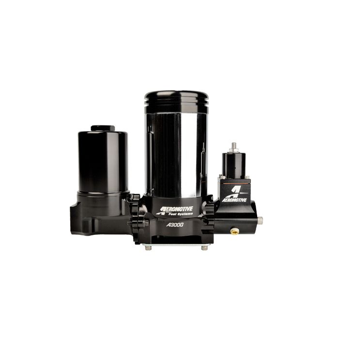 True Diaphragm Controlled Bypass Regulator Integrated into the pump – Similar design to the A2000, the regulator provides smoother and more controlled flow and pressure as well as dampens pressure spikes. – The new A3000 design allows for the regulator to be clocked in 45º increments like the filter for additional chassis clearance. – Regulator can be removed and run as a true bypass regulator. – Regulator’s bolt pattern matches to the Aeromotive Stackable Regulators (P/N 13217) allowing the ultimate in pressure control and nitrous fuel system solutions.