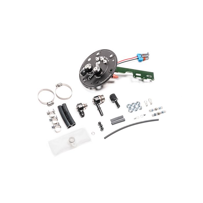 This Radium Engineering fuel hanger replaces the stock fuel pump assembly. No cutting or modifying of the vehicle's sheet metal or fuel tank is required for installation.
