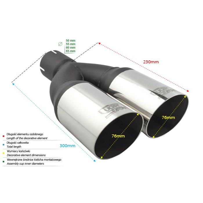 The Ulter Sport exhaust tip is a perfect solution when looking for high-quality components for the construction of your exhaust systems. Advanced technology and precise design, Ulter Sport exhaust tips ensure perfect exhaust gas flow, extracting maximum power from the engine and emphasizing the sound of engine and exhaust. Available in various configurations and styles, Ulter Sport exhaust tips enhance the appearance of your car, adding a sporty character and an sport sound. Additionally, the use of high-quality materials, such as polished stainless steel, guarantees long-term durability and corrosion resistance. Ulter Sport exhaust tips work perfectly with your car's existing exhaust system to ensure smooth exhaust flow. Whether you want to improve the performance of your sports car or simply make optical modifications, Ulter Sport exhaust tips will surely meet your expectations. Thanks to their installation, your car will not only gain an additional strong sound, but will also gain in appearance, becoming a unique and individual vehicle. If you are looking for a proven solution that combines high quality workmanship, efficiency and aesthetics, Ulter Sport exhaust tips are the perfect choice for you. Give your car even more character by choosing a product from Ulter Sport company. The end tip should be installed using a clamp or welding. The tip is made in Poland. Made of the highest quality steel.