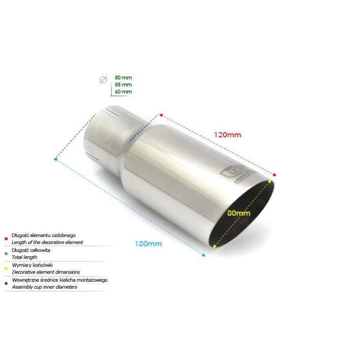 The Ulter Sport exhaust tip is a perfect solution when looking for high-quality components for the construction of your exhaust systems. Advanced technology and precise design, Ulter Sport exhaust tips ensure perfect exhaust gas flow, extracting maximum power from the engine and emphasizing the sound of engine and exhaust. Available in various configurations and styles, Ulter Sport exhaust tips enhance the appearance of your car, adding a sporty character and an sport sound. Additionally, the use of high-quality materials, such as polished stainless steel, guarantees long-term durability and corrosion resistance. Ulter Sport exhaust tips work perfectly with your car's existing exhaust system to ensure smooth exhaust flow. Whether you want to improve the performance of your sports car or simply make optical modifications, Ulter Sport exhaust tips will surely meet your expectations. Thanks to their installation, your car will not only gain an additional strong sound, but will also gain in appearance, becoming a unique and individual vehicle. If you are looking for a proven solution that combines high quality workmanship, efficiency and aesthetics, Ulter Sport exhaust tips are the perfect choice for you. Give your car even more character by choosing a product from Ulter Sport company. The end tip should be installed using a clamp or welding. The tip is made in Poland. Made of the highest quality steel.