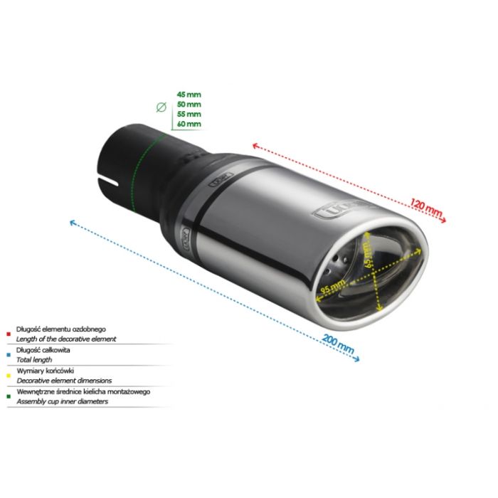 The Ulter Sport exhaust tip is a perfect solution when looking for high-quality components for the construction of your exhaust systems. Advanced technology and precise design, Ulter Sport exhaust tips ensure perfect exhaust gas flow, extracting maximum power from the engine and emphasizing the sound of engine and exhaust. Available in various configurations and styles, Ulter Sport exhaust tips enhance the appearance of your car, adding a sporty character and an sport sound. Additionally, the use of high-quality materials, such as polished stainless steel, guarantees long-term durability and corrosion resistance. Ulter Sport exhaust tips work perfectly with your car's existing exhaust system to ensure smooth exhaust flow. Whether you want to improve the performance of your sports car or simply make optical modifications, Ulter Sport exhaust tips will surely meet your expectations. Thanks to their installation, your car will not only gain an additional strong sound, but will also gain in appearance, becoming a unique and individual vehicle. If you are looking for a proven solution that combines high quality workmanship, efficiency and aesthetics, Ulter Sport exhaust tips are the perfect choice for you. Give your car even more character by choosing a product from Ulter Sport company. The end tip should be installed using a clamp or welding. The tip is made in Poland. Made of the highest quality steel.