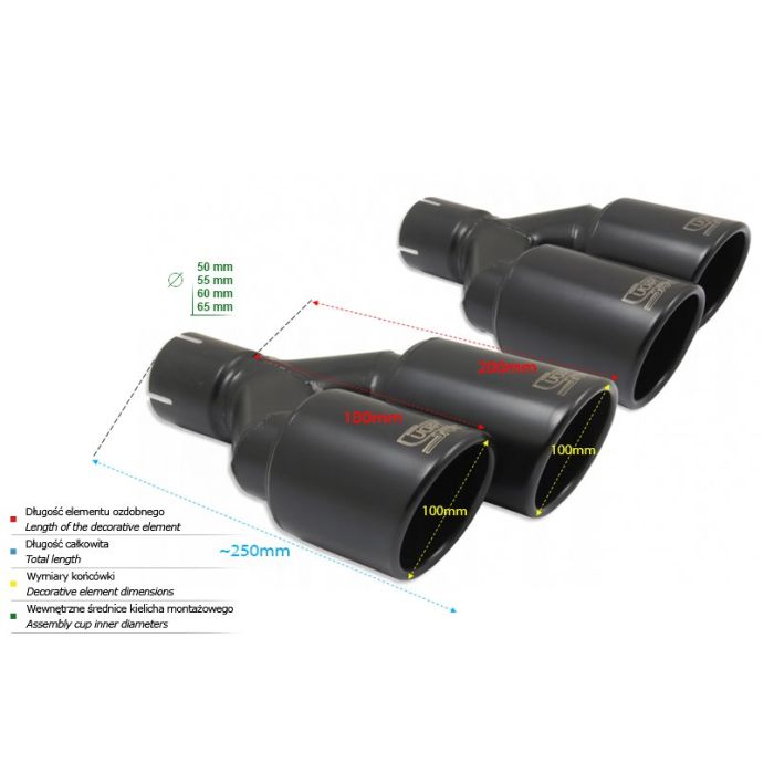 The Ulter Sport exhaust tip is a perfect solution when looking for high-quality components for the construction of your exhaust systems. Advanced technology and precise design, Ulter Sport exhaust tips ensure perfect exhaust gas flow, extracting maximum power from the engine and emphasizing the sound of engine and exhaust. Available in various configurations and styles, Ulter Sport exhaust tips enhance the appearance of your car, adding a sporty character and an sport sound. Additionally, the use of high-quality materials, such as polished stainless steel, guarantees long-term durability and corrosion resistance. Ulter Sport exhaust tips work perfectly with your car's existing exhaust system to ensure smooth exhaust flow. Whether you want to improve the performance of your sports car or simply make optical modifications, Ulter Sport exhaust tips will surely meet your expectations. Thanks to their installation, your car will not only gain an additional strong sound, but will also gain in appearance, becoming a unique and individual vehicle. If you are looking for a proven solution that combines high quality workmanship, efficiency and aesthetics, Ulter Sport exhaust tips are the perfect choice for you. Give your car even more character by choosing a product from Ulter Sport company. The end tip should be installed using a clamp or welding. The tip is made in Poland. Made of the highest quality steel.