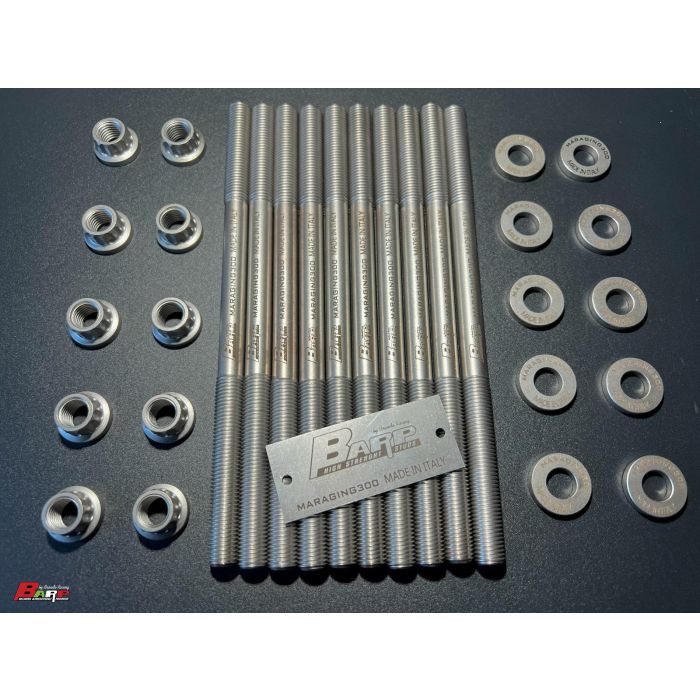 BARP is proud to offer and present to the international and national public, the line of the most resistant main and head stud in the world. Made of maraging 300, (currently the most tenacious metal discovered and known) tested up to 10 BAR of turbo boost and up to 1500 HP per cylinder its used in tractor pulling engine and Top Fuel engine. They have strenght of over 220 kg/mm2 (335,000 PSI), 30% greater than the current reference material, the Custom Age 625. This type of studs bolt kit is the absolute top and is used on very high power engines, withstanding stresses beyond any limit in an excellent way. Using BARP studs realized in MARAGING 300, the possibility of any failure or movement of the tightened parts will be completely eliminated. They represent the obligatory choice for those who want to go beyond the limit and want to exclude the possibility of failure from this type of component.