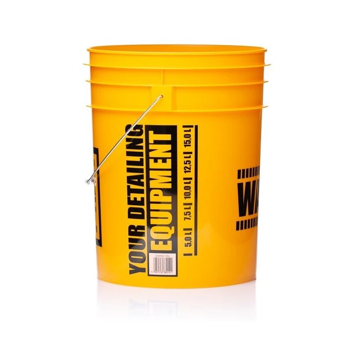 Professional bucket for washing the car. Made of strong HDPE material. Measurements on the side of the bucket come in handy when measuring the right amount of water poured in. The maximum capacity of the bucket is 20 liters. Additionally equipped with a metal handle for easy portability. Marked with the word "WASH", suggesting the product's intended use.
