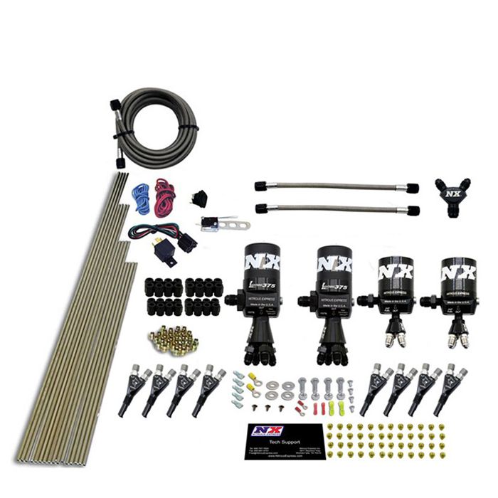 This system includes 8 of the patented NX Shark Nozzles, 2 NX Lightning 375 Nitrous solenoids, 2 NX Lightning series fuel solenoids, anodized aluminum distribution blocks, 3/16 stainless hard lines, nickel plated fittings, Jetting for 200-2100HP, -8 stainless braided nitrous feed lines, a high flow -8 Y fitting, a wide open throttle switch, 40 Amp relays and relay harnesses, master arming switch, stainless bottle brackets and a nitrous bottle with the Lightning 500 bottle valve.