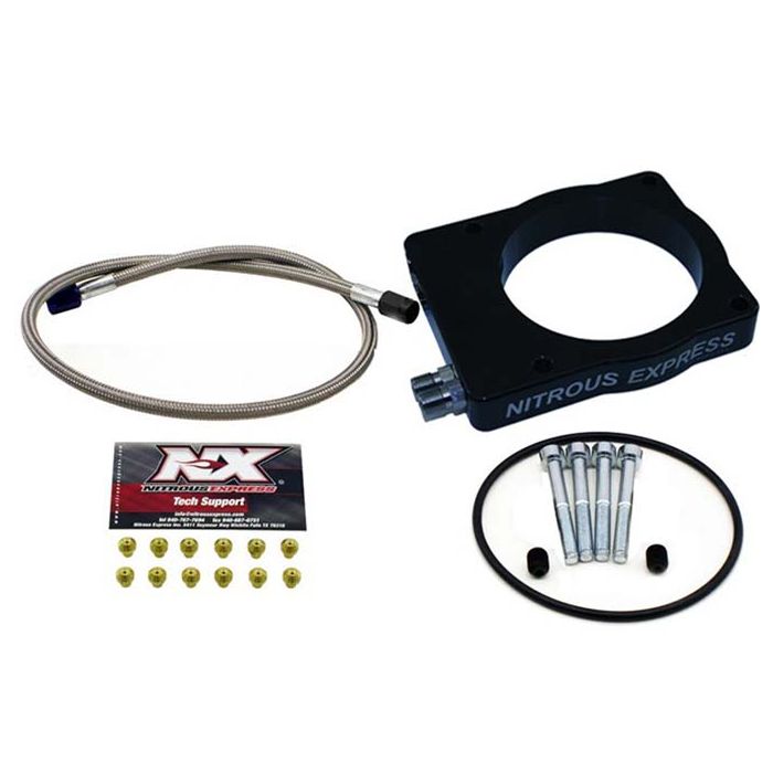 The Nitrous Express Plate for HEMI vehicles upgrade features a billet nitrous plate that fits HEMI throttle bodies, including Challenger, Chrysler 300 Dodge Rams and Chargers with the 5.7L-6.4L Hemi Engines. This plate bolts between the throttle body and intake making installation quick, easy and attractive. This conversion kit includes the nitrous plate, longer throttle body bolts, braided stainless nitrous and fuel lines as well as jetting for 50, 100, 150, 200, 250, 300, 350 and 400 horsepower.