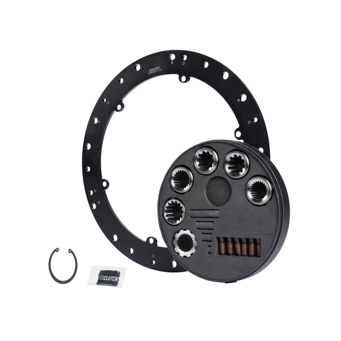 UniClutch Vehicle Fitment Kit includes a Multi-Fit Flywheel Mount, Transmission Spline Set, 12.9 Grade Bolt Kit. Suits 240mm UniClutch.