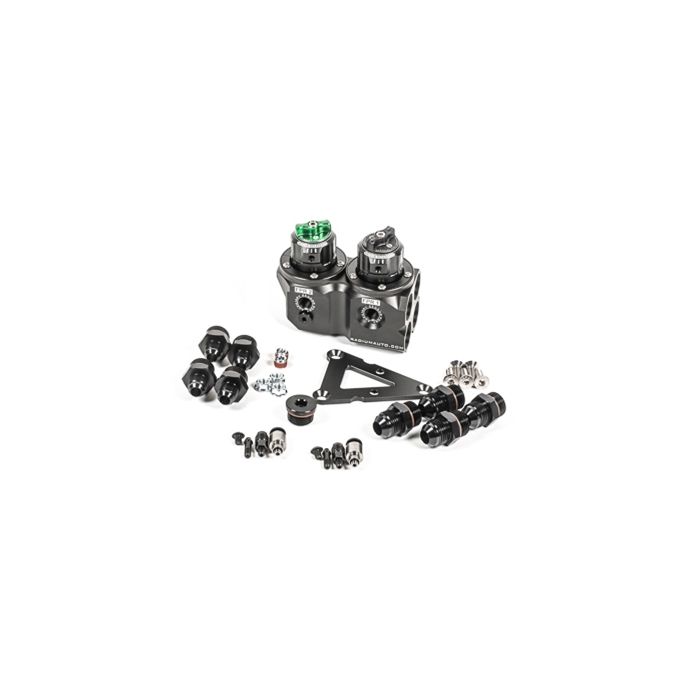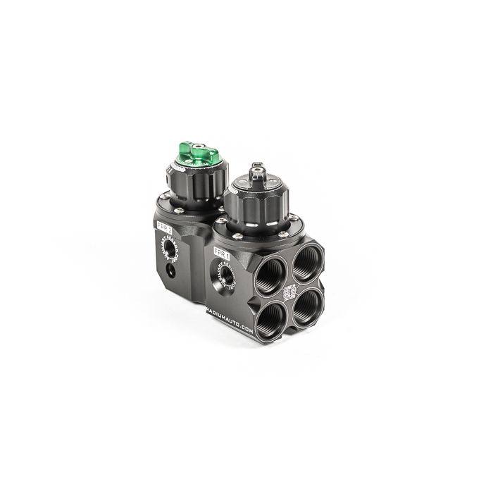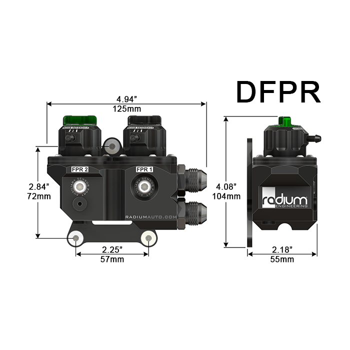 The Radium Engineering DFPR (Dual Fuel Pressure Regulator) was designed specifically for custom fuel systems that use both direct injection and port injection. The DFPR permits independent fuel pressures for each system while using 1 fuel feed input. Furthermore, the architecture suppresses the aggressive pressure spikes created by the mechanical (positive displacement plunger-type) HPFP pump used for direct injection. FPR1 is used for direction injection and FPR2 is used for port injection.