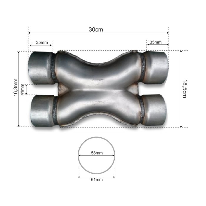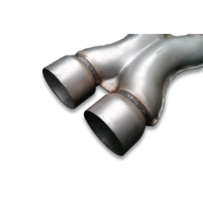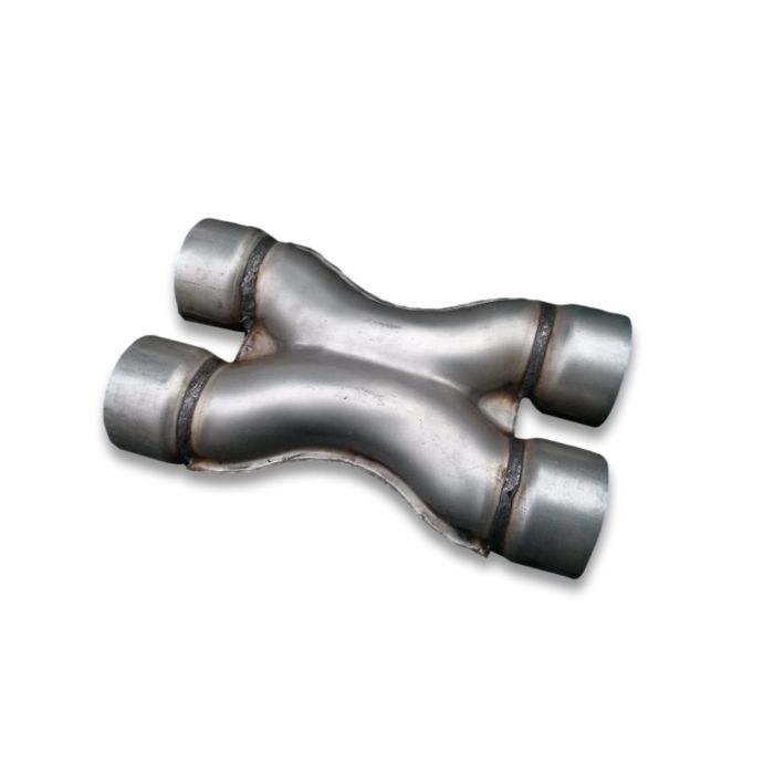 X-Pipe, inlets/outlets diameter 57mm, made of aluminum coated steel (SS409) - very low weight. It is an essential element in the V-engines exhaust system in which the exhaust accelerates and levels the pressure between the cylinder banks. It has a positive impact on the power and torque. It also mutes the exhaust giving it an interesting sound.