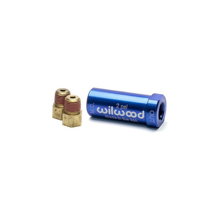 Wilwood's two, four and ten pound residual pressure valves retain a minimum brake line pressure to help eliminate excessive pedal travel in both disc and drum brake systems. The two pound valve is used in disc brake applications where the master cylinder is mounted below the horizontal plane of the calipers and fluid drain back occurs from gravity and vibration, thereby causing excessive caliper piston retraction and a longer brake pedal stroke. The minimal two pound residual pressure prevents fluid from flowing back without causing the brakes to drag. Four pound valves can be beneficial in high vibration brake sytems such as off-road or dirt circle track racing. With drum brakes, a ten pound valve is used to compensate for return spring tension and maintain wheel cylinder sealing in the drums. Residual Pressure Valves are made from billet aluminum and color coded for easy identification. Valves with fittings are supplied with two 1/8-27 NPT to 3/8-24 inverted flare female fittings that will fit most domestic 3/16th hard brake lines.