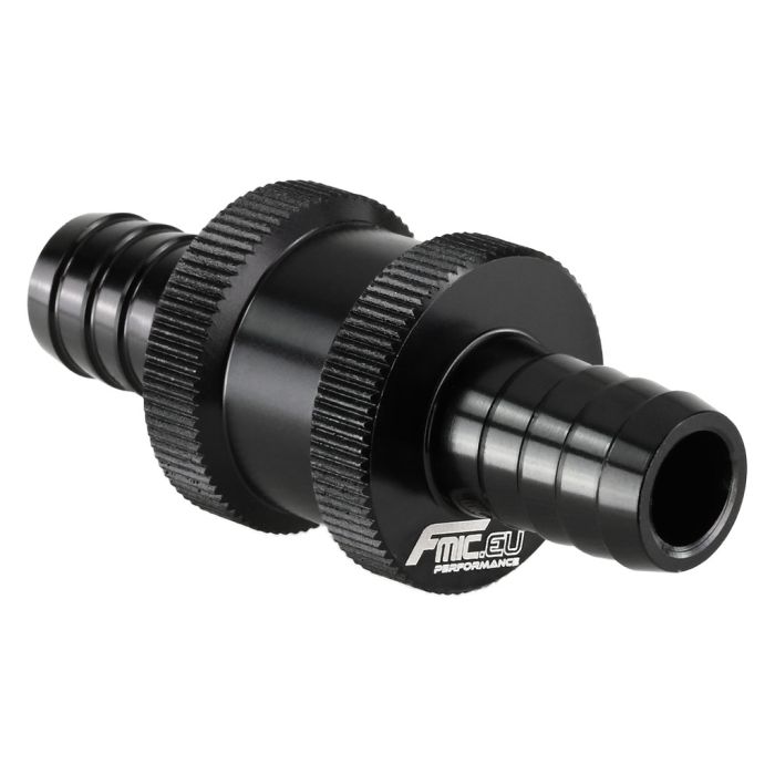 High-quality universal check valve by FMIC.EU designed for use in vacuum, fuel, and diesel systems. Made from durable aluminium with a black anodized finish, it offers excellent chemical and mechanical resistance under demanding conditions. The valve allows flow in only one direction, effectively preventing backflow.